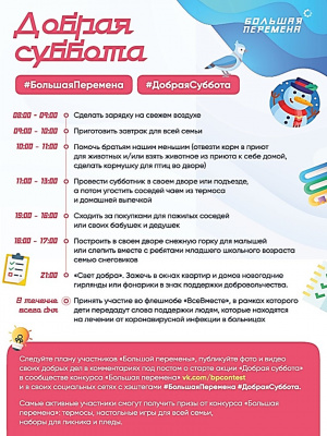 Презентация акции школьникам – показ видеоролика о старте акции в учреждениях основного и дополнительного образования и размещение афишы с планом «Доброй субботы» на информационных стендах в образовательных учреждениях. Выполнение добрых дел учащимися самостоятельно и вместе с родителями (в соответствии с планом, предложенным участниками «Большой перемены»). Фото и видеосъемка выполнения мероприятий плана. Публикация фото и видео под постом о старте Акции в сообществе «Большая перемена» https://vk.com/bpcontest и своих социальных сетях с мотивационным рассказом о том, почему совершать добрые поступки может каждый, и хэштегами #БольшаяПеремена #ДобраяСуббота.