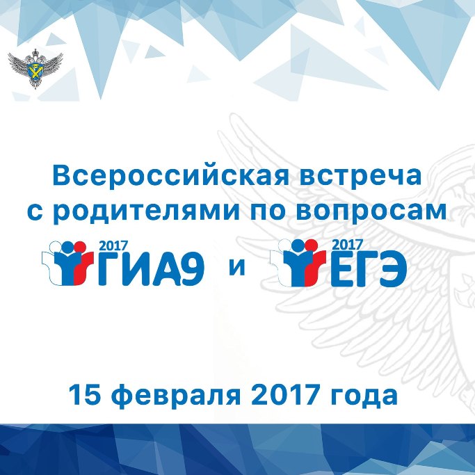 13.02.2017Руководиель Федеральной службы по надзору в сфере образования и науки ( Рособрнадзор) 15 февраля 2017 года в 11.00 по московскому времени проведет Всероссийскую встречу с родителями по воспросам проведеня государственной итоговой аттестации по программам основного общего и среднего общего образования в 2017 году. В день проведения мероприятия будет вестись онлайн-трансляция на официальном канале Youtube Рособрнадзора.