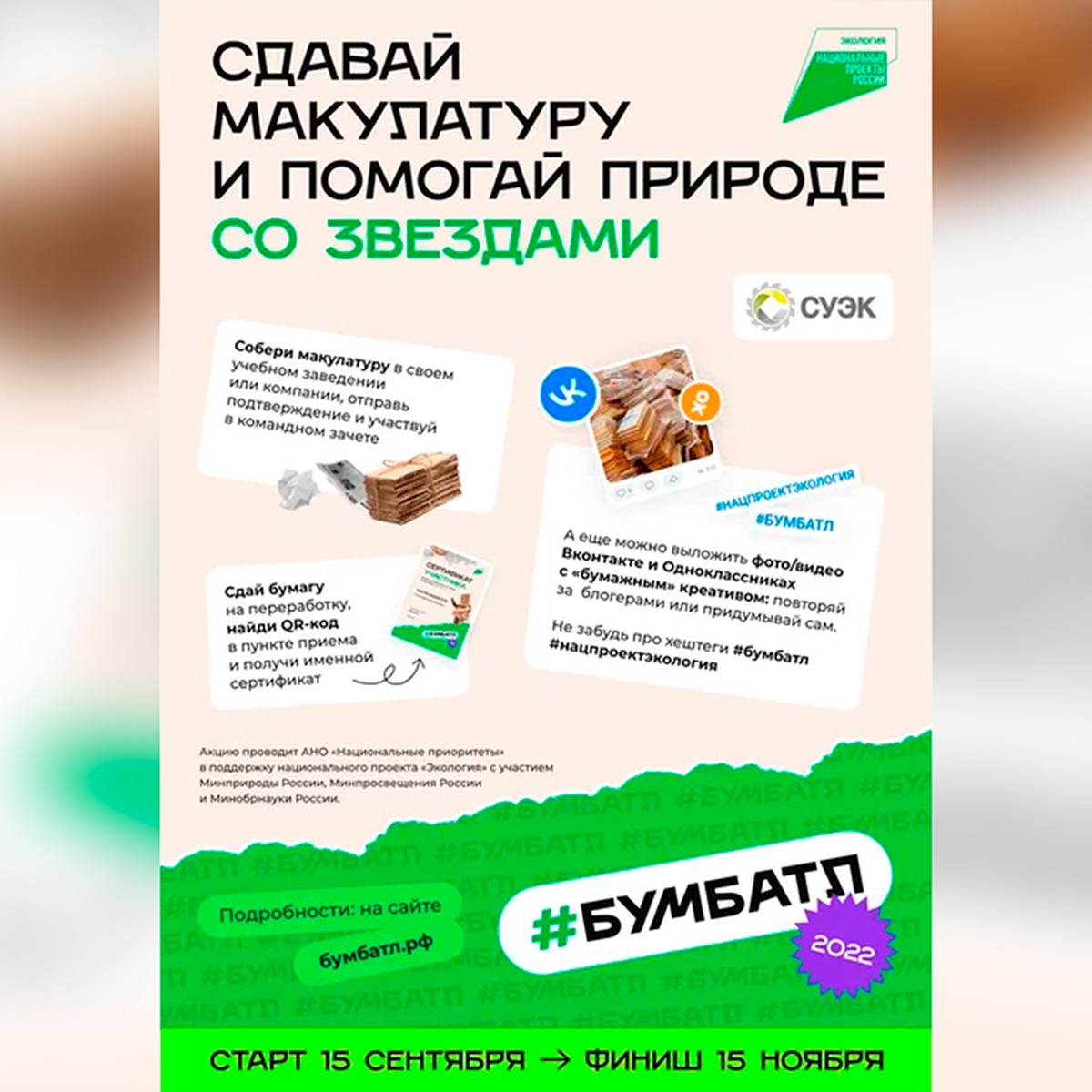 #БУМБАТЛ — это возможность проявить заботу о природе, сдав бумагу на переработку. Но, как и любой батл, это еще и соревнование по количеству собранной макулатуры! Бумагу можно сдать в детских садах, школах, вузах, колледжах, офисах компаний-участников и пунктах приема. Включайся в #БУМБАТЛ в своем регионе!А хочешь стрим со звездой — снимай и выкладывай в соцсети «бумажный» креатив. У тебя будет шанс увидеться с амбассадорами БумБатла.