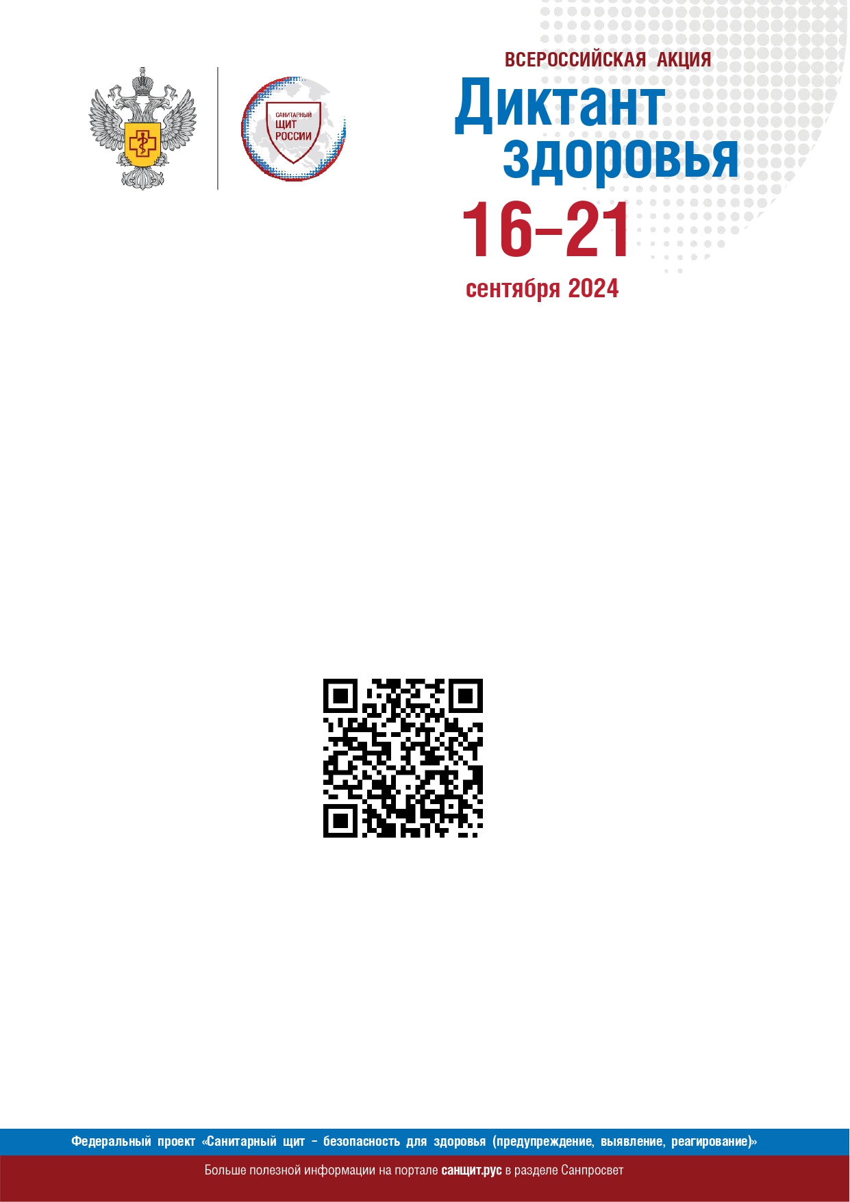 16.09.2024Цель мероприятия - популяризация основ санитарно-гигиенической грамотности, обучение школьников правилам и нормам здорового образа жизни.Акция реализуется в период с 16 сентября по 21 сентября 2024 года. В Акции могут принять участие представители всех социальнодемографических групп в возрасте от 13 лет и старше.Акция будет проведена в очном и дистанционном формате в виде онлайнопросника, размещенного на созданном Роспотребнадзором ресурсе Санщит.рус.