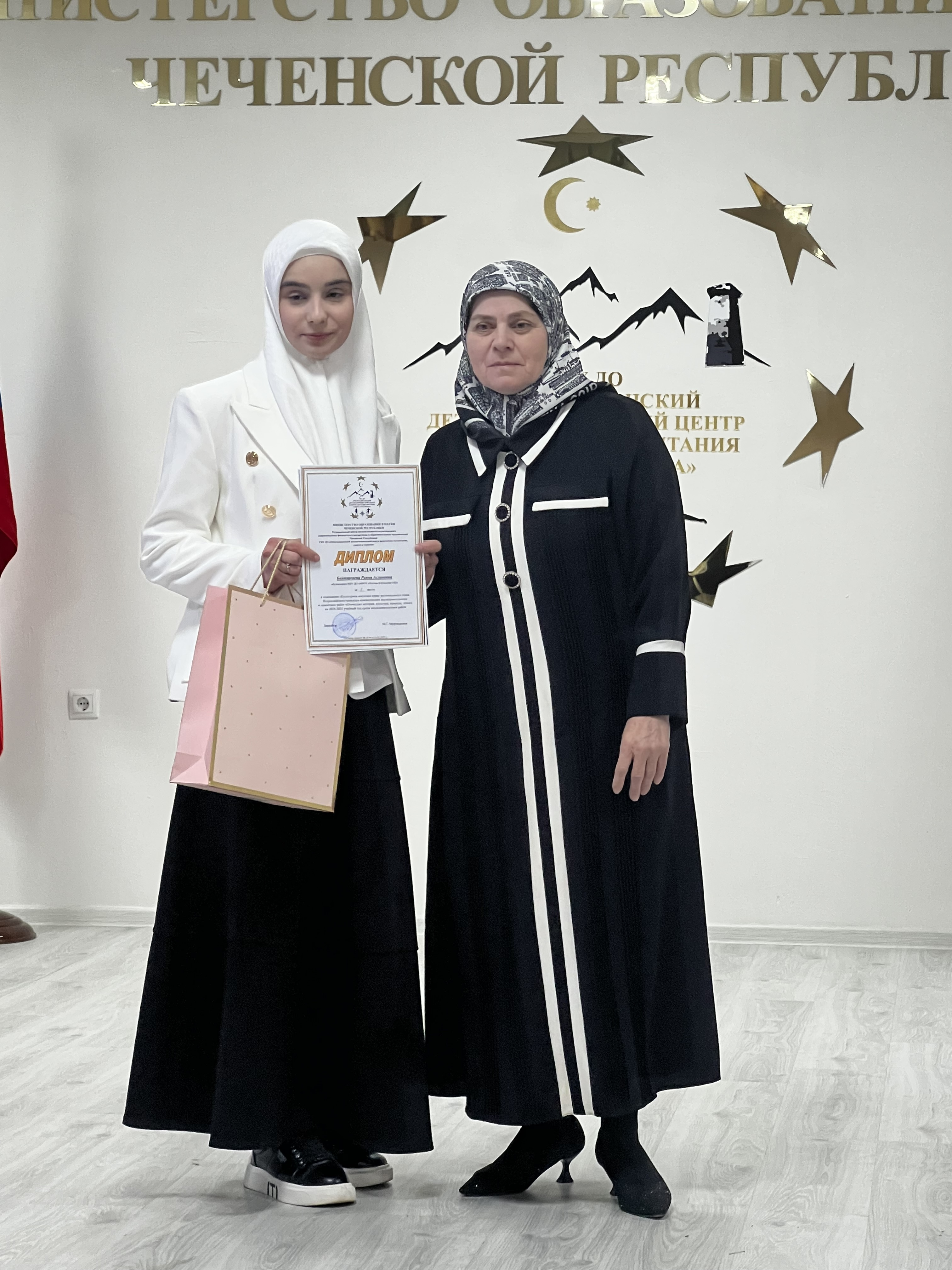 В рамках реализации нацпроекта «Молодежь и дети» в городе Грозном состоялся Всероссийский конкурс краеведческих исследовательских и проектных работ «Отечество: история, культура, природа, этнос» где обучающиеся 42 общеобразовательных учреждений приняли участие. Среди них была и наша Раяна, которая в очном туре на базе ГБУ ДО «Республиканский детско-юношеский центр физического воспитания, спорта и туризма», она представила свой исследовательский проект на тему: «Изучая творчество великих мастеров. Гадаев Моьмад-Салахь» в номинации «Культурное наследие края»