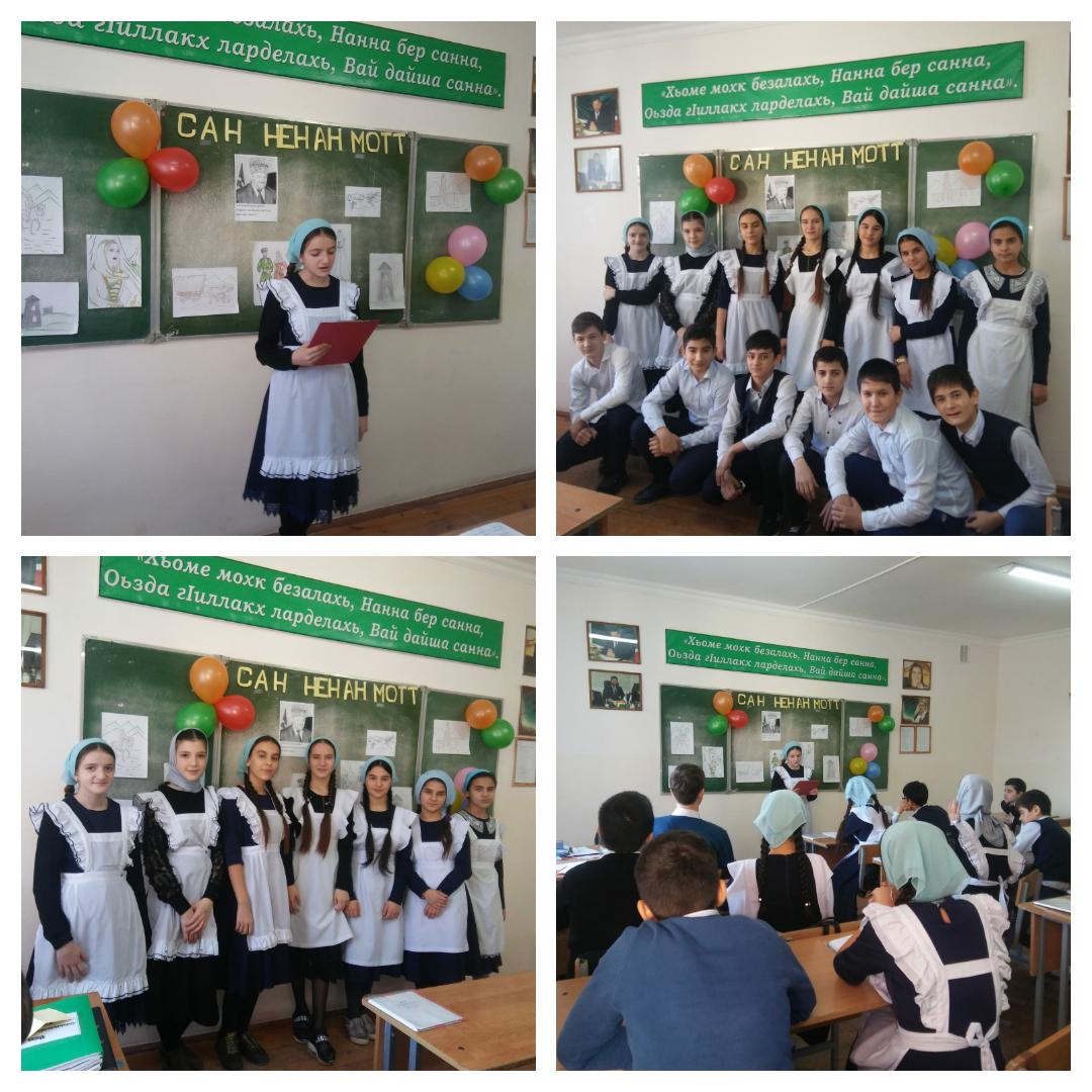 20.02.2019В МБОУ "Илсхан-Юртовская ОШ" 20.02.2019 г. классный руководитель 7 "б" класса Ойбуева Ф.А. провела классный час по теме: "Сан ненан мотт". Где учащиеся 7 "б" класса показали, что искренне любят и уважают свой родной язык.